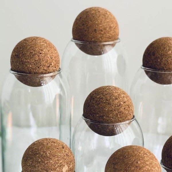 Descubrí este frasco de vidrio liso con tapa de corcho esfera, ideal para conservar y presentar tus productos con elegancia y naturalidad.
